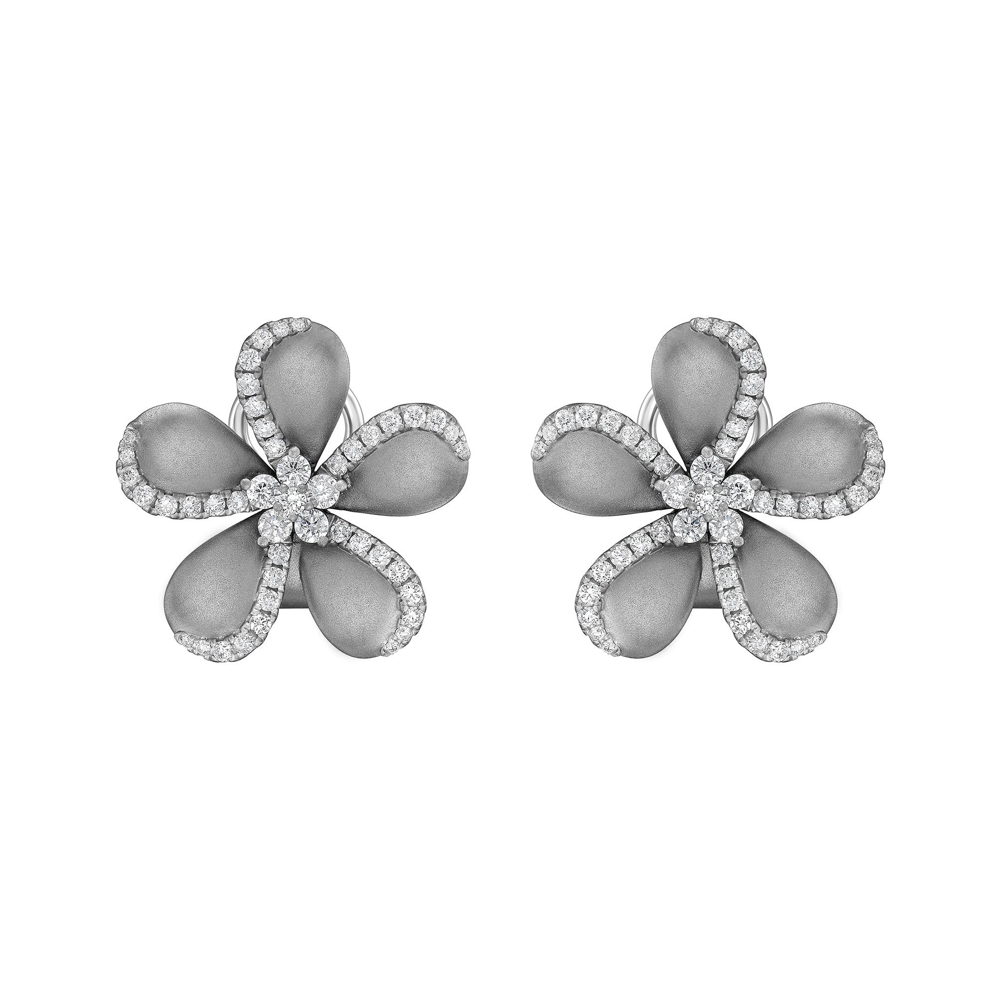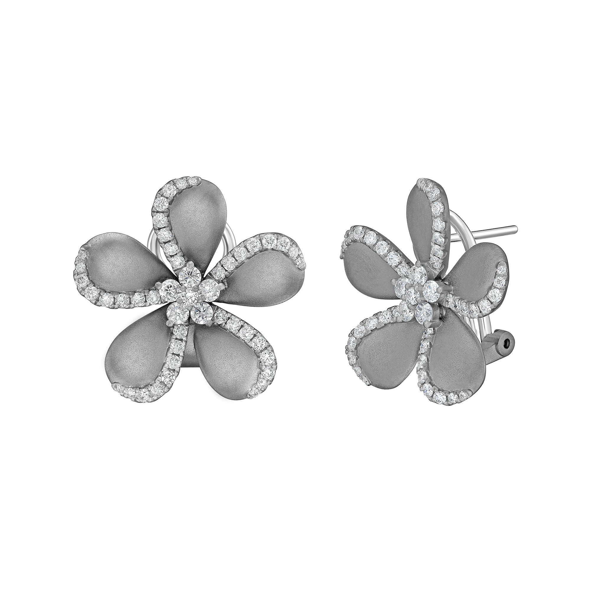 These five-petal floral stud earrings are crafted in polished 18K black rhodium plated gold and accented with diamond detailing along each petal. At the center, a cluster of diamonds forms a delicate five-stone bloom, adding soft brilliance and dimension. Lightweight and timeless, these diamond floral studs are designed for everyday wear and transition effortlessly through every season and occasion.