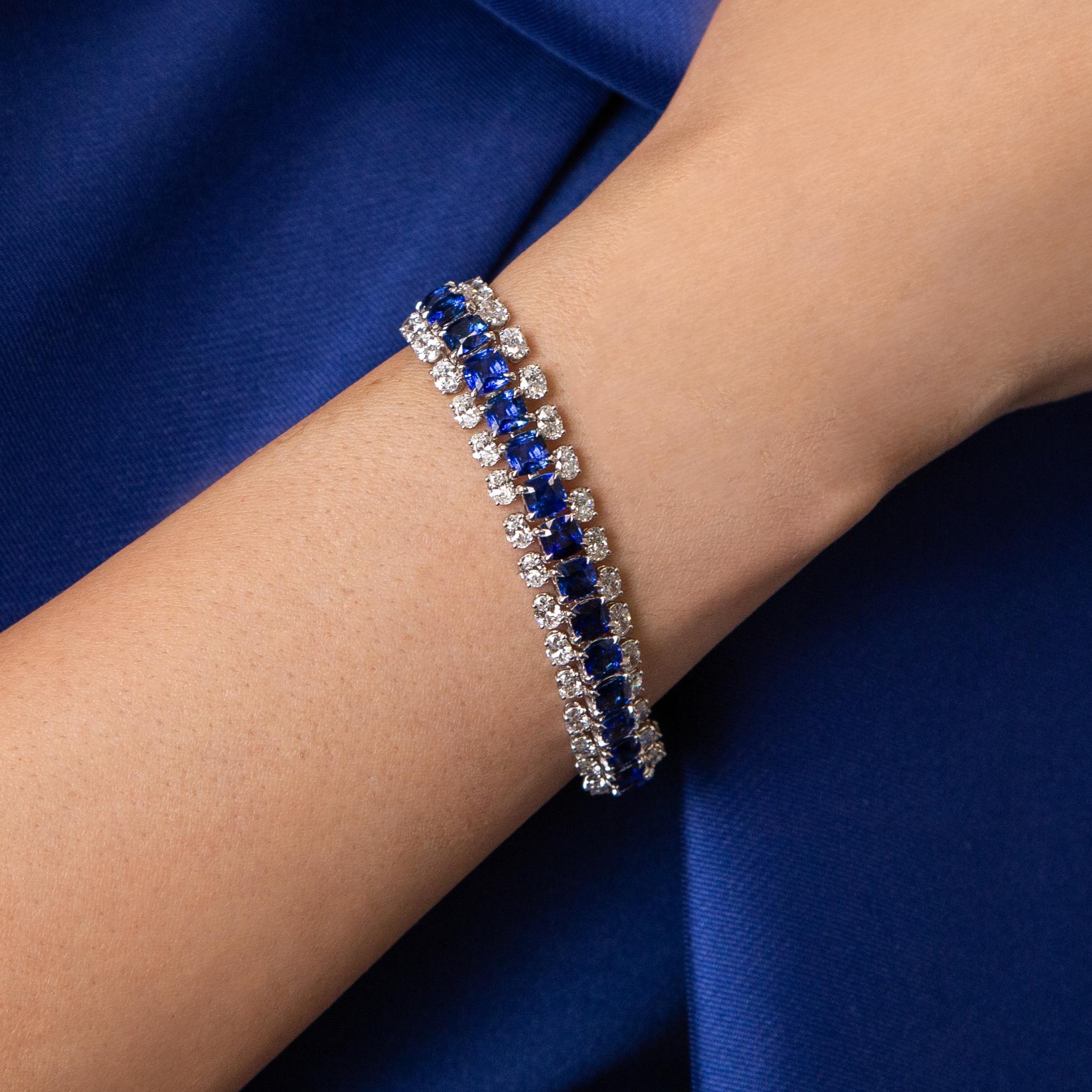 This extraordinary design features hand-selected, intensely vivid cushion cut blue sapphires with unparalleled depth and color. Brilliant cut natural white diamonds are meticulously set in delicate rows to amplify the effect. Its intricate construction and the exceptional quality of each gemstone ensure it is not just a piece of jewelry, but a legacy - destined to captivate for generations to come.