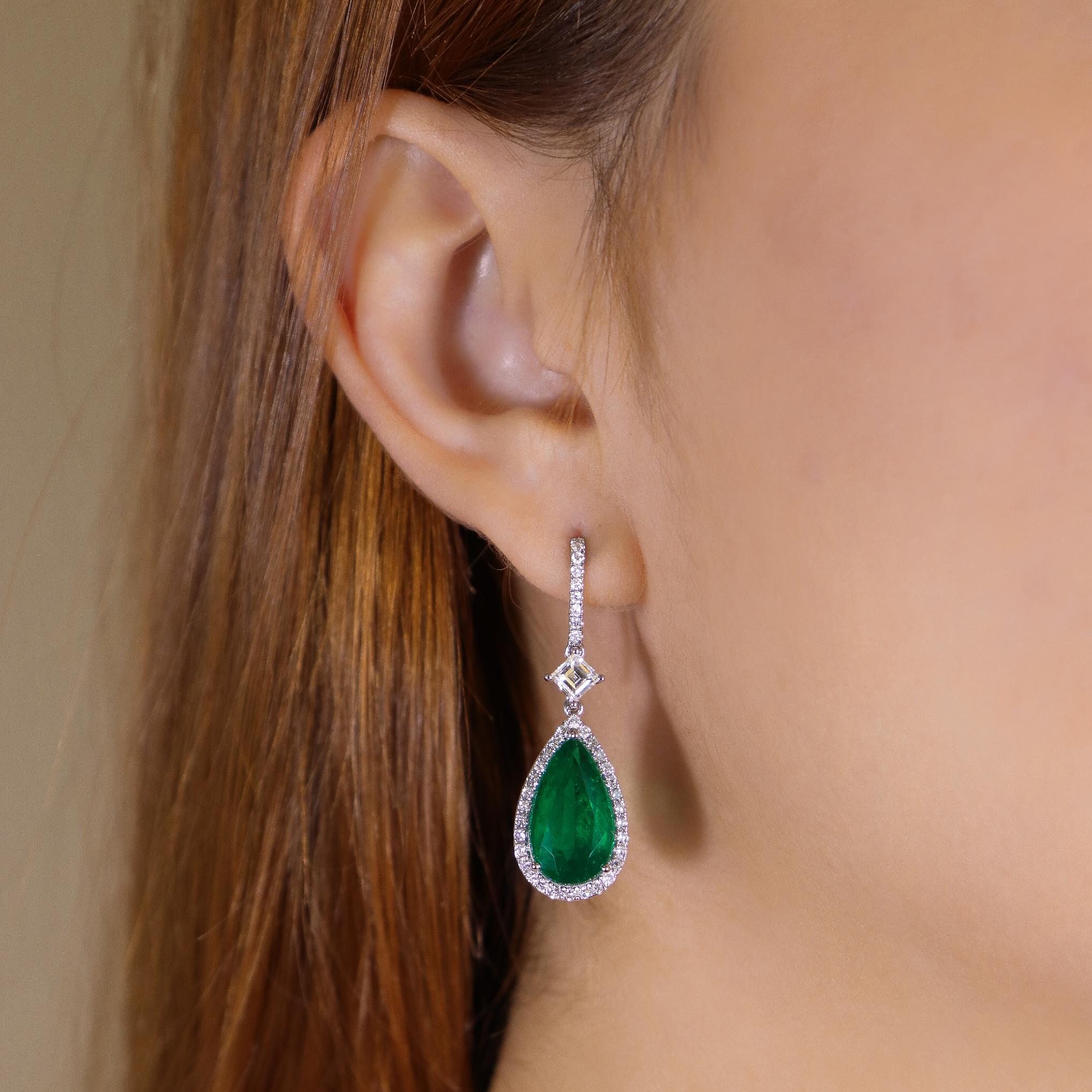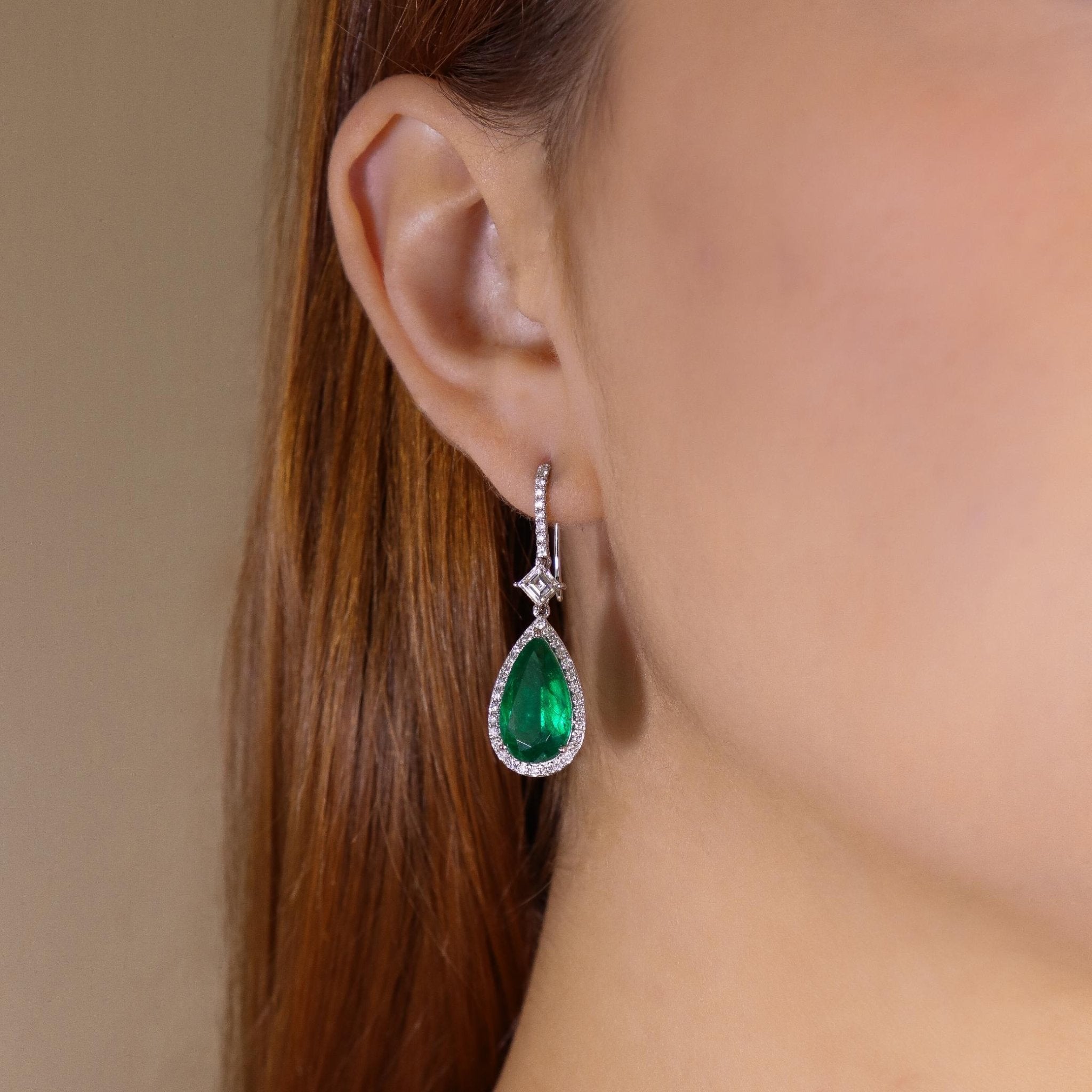 A breathtaking masterpiece for your special day, the Palais Statement Earrings are a celebration of vibrant color and light. Cascading from an 18k white gold setting, a magnificent pear-cut Colombian emeralds take center stage, encircled by halos of brilliant diamonds. These exquisite earrings are more than a bridal accessory—they are a stunning heirloom, a perfect symbol of new beginnings and everlasting elegance.