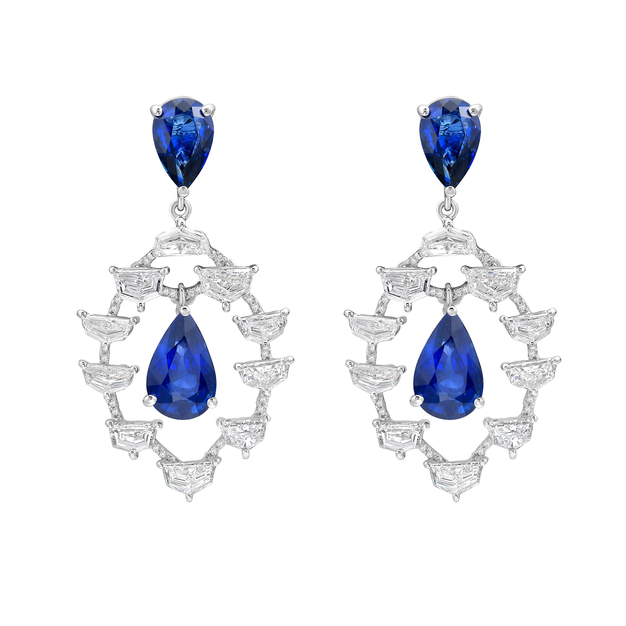 These white gold statement earrings fuse architectural artistry with unmistakeable allure. Vivid pear-cut blue sapphires are encircled by a sculptural halo of art-deco inspired cadillac-cut diamonds. The distinctive geometric facets of these rare cuts create a play of light, framing the blue sapphires in fluid motion. Bold, masterfully crafted, and exquisitely refined, they redefine contemporary jewelry with sculptural poise and everlasting glamour.