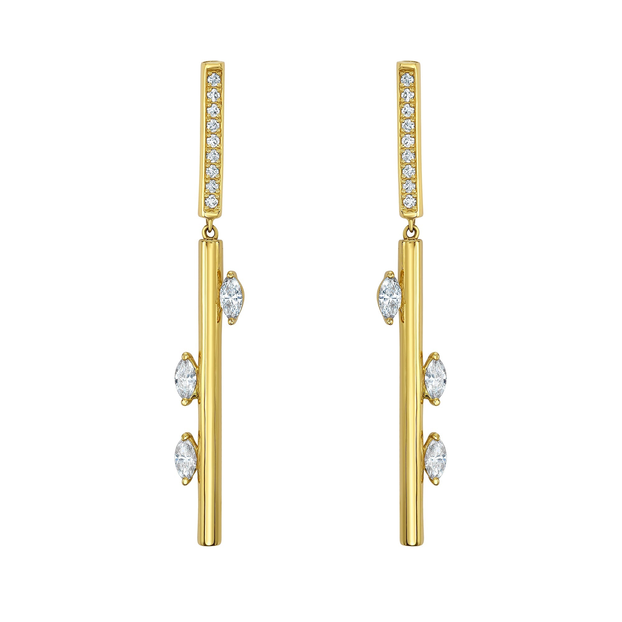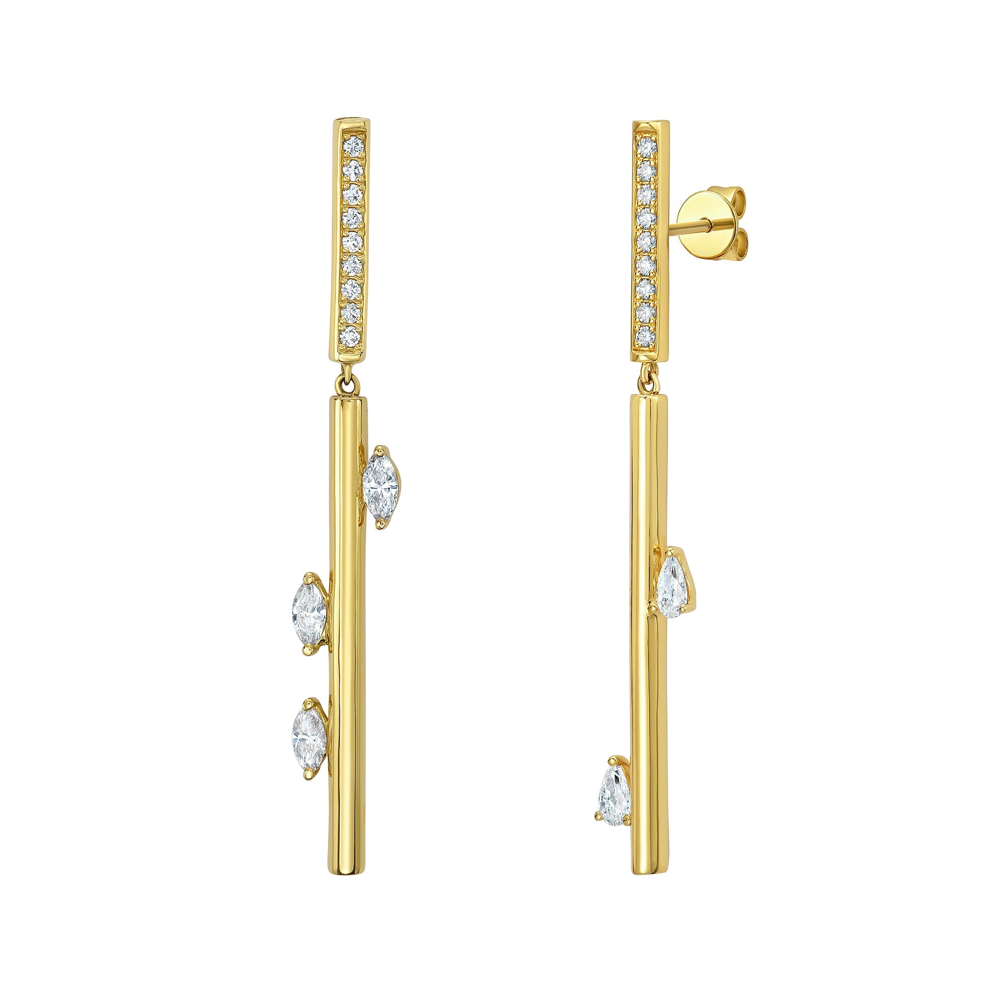Sleek, luminous, and impeccably modern, these Elia Diamond Drop Earrings are a study in refined movement and contemporary elegance. Crafted in polished 18K yellow gold, each earring begins with a vertical bar of pavé-set diamonds that leads to a slender, elongated gold drop. Teardrop and marquis cut diamonds hang like dewdrops, catching light from all angles.