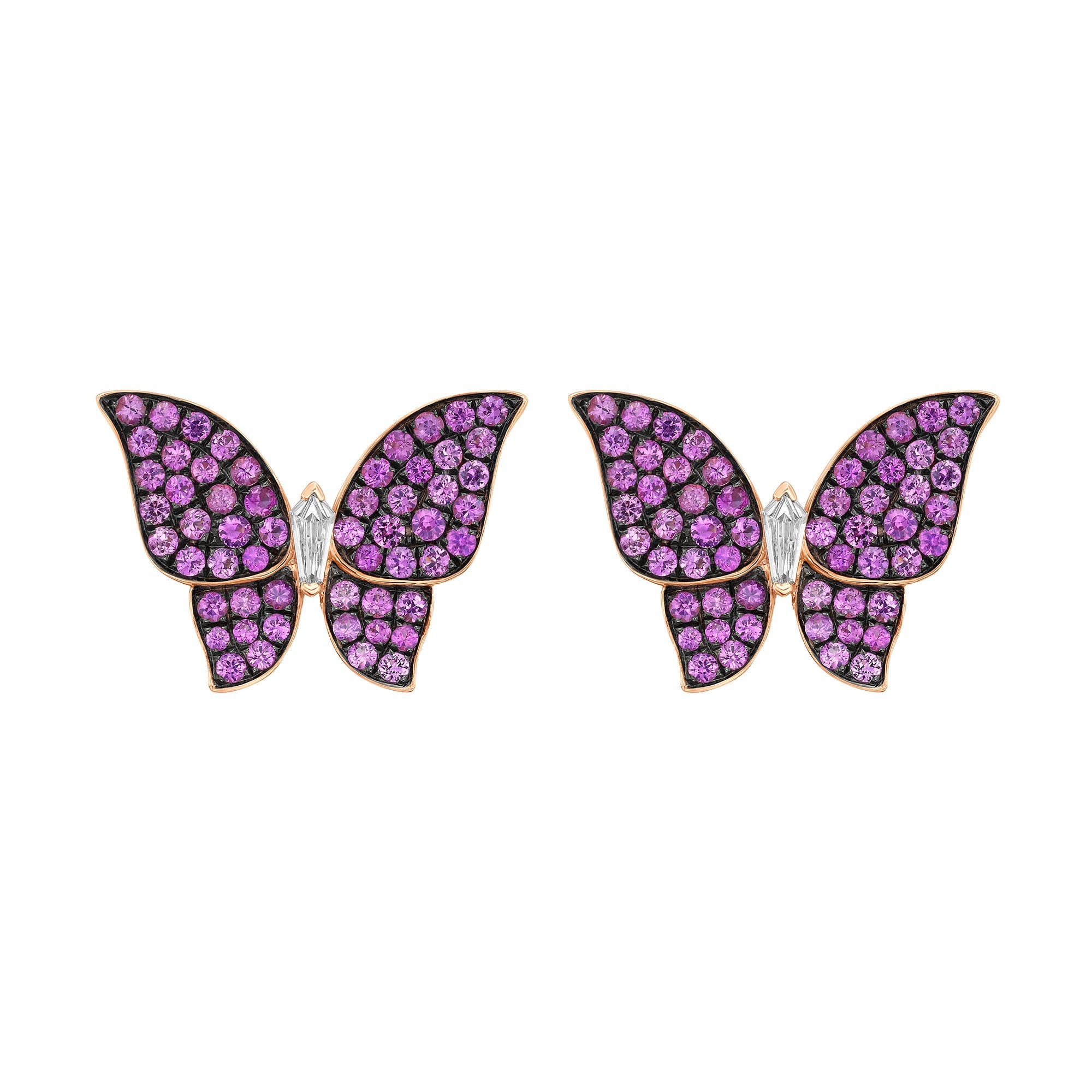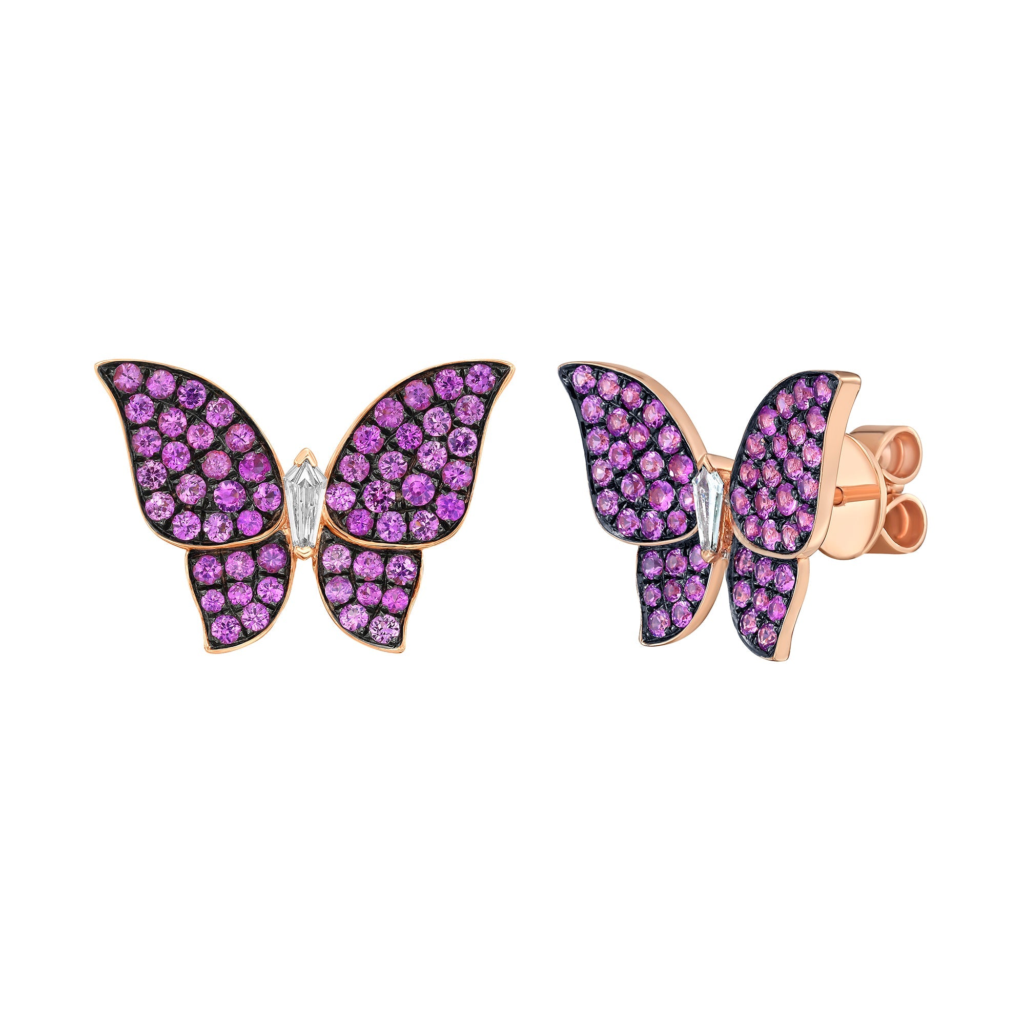 Playful yet exquisitely crafted, these Morphia Pink Sapphire Butterfly Stud Earrings are a whimsical expression of fine jewelry artistry. Crafted in warm 18K rose gold, each butterfly is brought to life with pavé-set pink sapphires that create a vivid, jewel-toned shimmer across the wings. At the center, a kite-cut diamond forms a delicate body, adding crisp brilliance and elegant contrast to the soft pink hues.