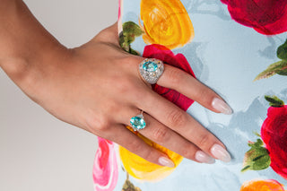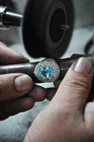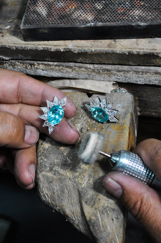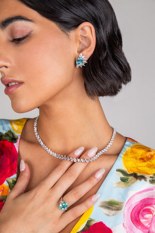 The Costa Paraiba Studs perfectly complement our Costa Ring, both showcasing the same striking craftsmanship. At their center, vivid Paraiba tourmalines capture the electric blue of the Maldivian ocean, framed by a precise halo of kite-shaped diamonds inspired by the region’s coral reefs. Ruchi drew from the contrast between these organic structures and the brilliance of the sea, translating it into a design that is both sculptural and fluid. A true statement with heirloom appeal, these studs balance elegance and boldness—ideal for evening wear yet effortlessly sophisticated for every day.