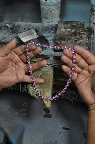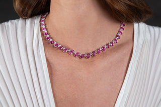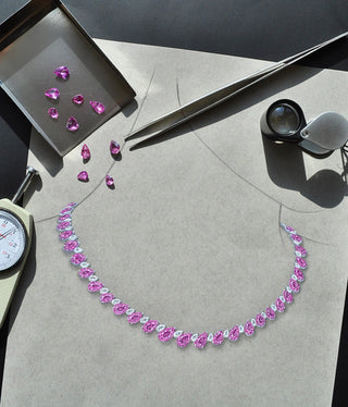 The Zafiro Pink Sapphire Necklace from Ruchi’s 2024 Holiday Collection is a masterpiece of movement and elegance. Cascading pear-shaped pink sapphires increase in size toward the center, creating a bold focal point. Interspersed with pear-shaped diamonds, the design gives the illusion of floating gemstones. A perfect blend of meticulous craftsmanship and opulent design, this necklace makes a sophisticated statement.