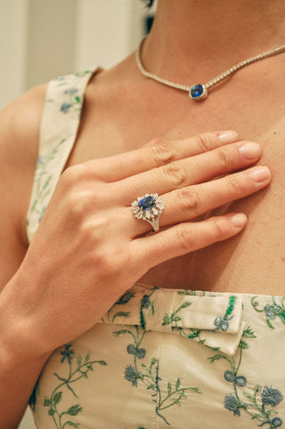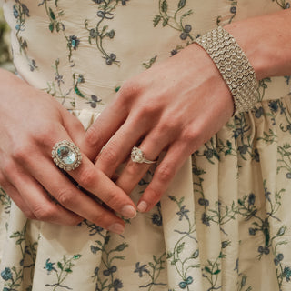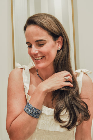 From Alexandra's jewelry box: her go-to for everyday elegance is the Juniper Leaf studs. Paired with our bespoke Celeste Blue Sapphire Statement Bracelet, it's the perfect combination for an event-ready look.