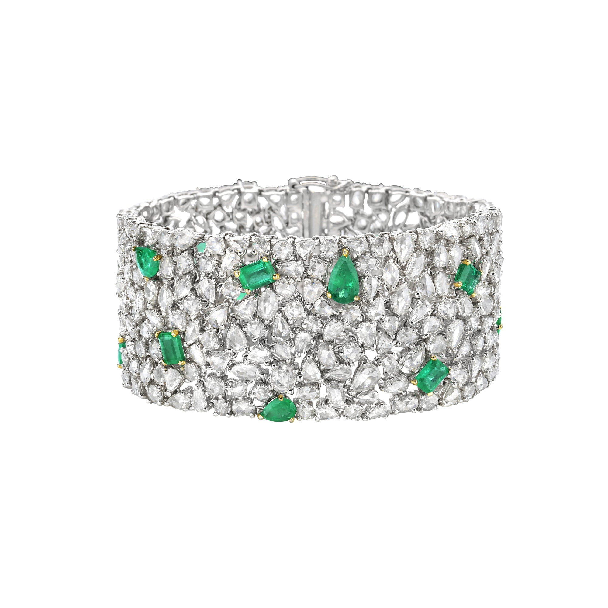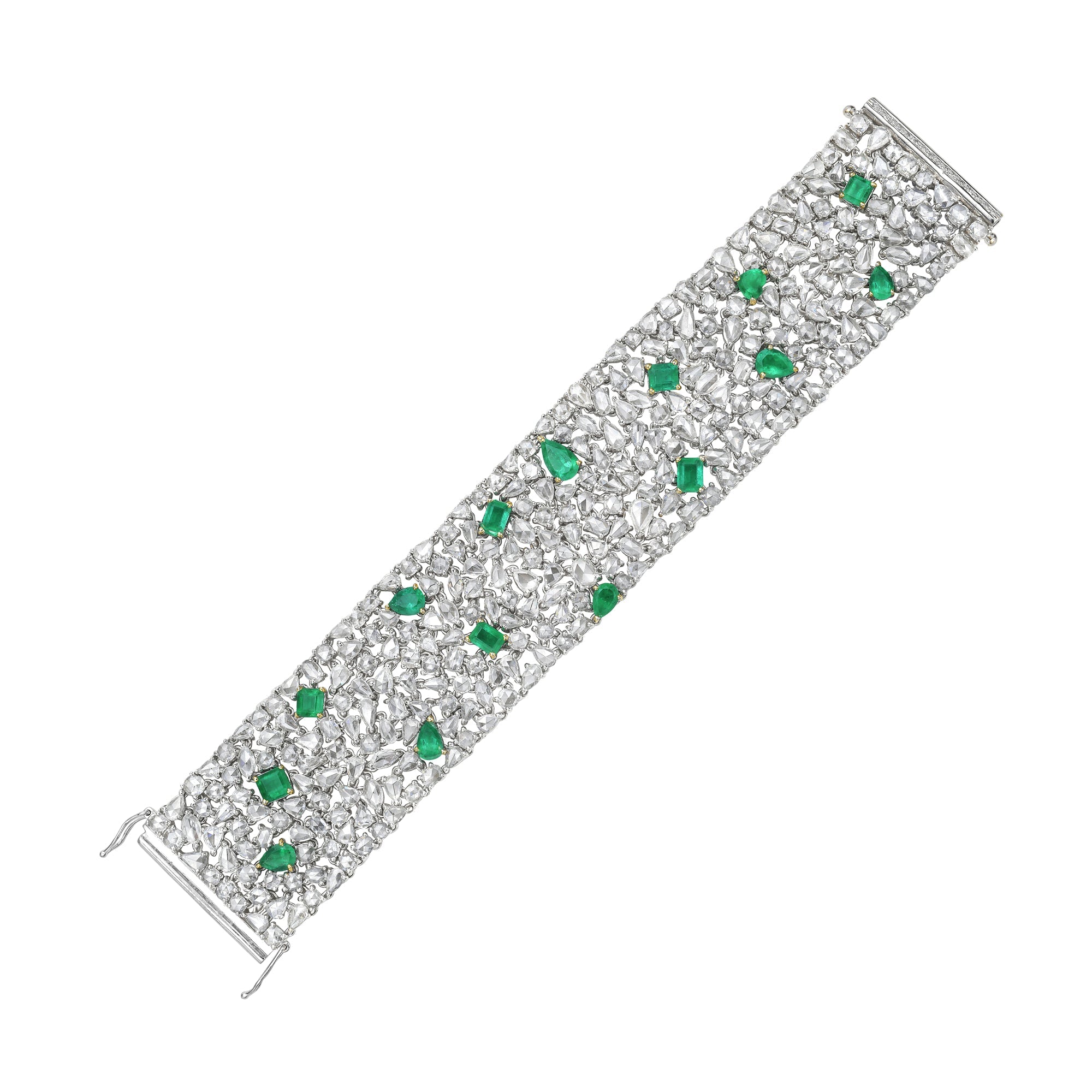 Celebrate color and light. A true masterpiece of artistry, this one-of-a-kind high jewelry bracelet in 18k white gold dazzles with a tapestry of rose-cut diamonds and natural Colombian emeralds. Each mixed cut gemstone is meticulously placed to create a bold yet graceful composition, blending heritage craftsmanship with modern opulence.